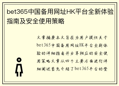 文章摘要:本文旨在为用户提供关于bet365中国备用网址HK平台全新体验的详细指南,并分享相应的安全使用策略。文章从四个主要方面进行详细阐述,首先介绍了bet365平台的登录与注册流程,确保用户能够顺利进入平台并开始体验。接着,我们深入探讨了平台的功能界面与操作流程,帮助用户更好地了解如何高效使用bet365的各种功能。第三部分重点讲解了安全使用策略,强调如何保护账户安全以及防范网络风险。最后,文章提供了如何正确处理可能出现的技术问题和客服沟通的建议。通过这些详细的分析,本文不仅为用户提供了一个全面的操作指南,还帮助大家提高了使用平台的安全意识。